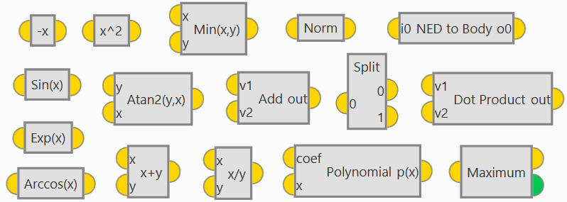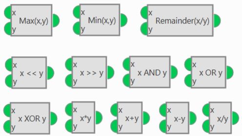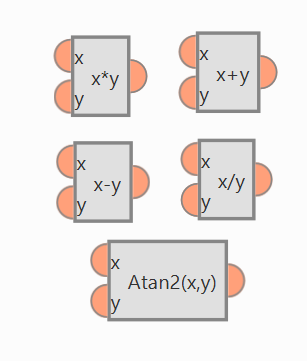 These blocks are used to perform arithmetic and trigonometric operations that require two input variables.