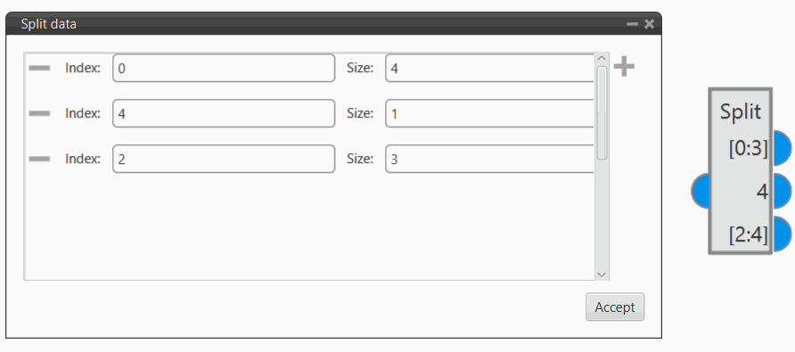 Each output produces a vector with the size (number of elements) indicated in Size from the element of the input vector indicated in the Index parameter.