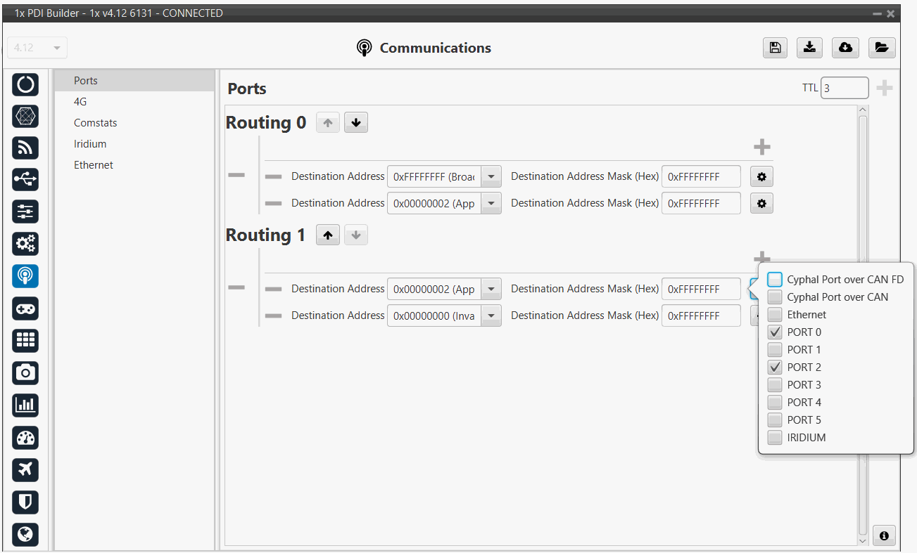 Ports configuration allows the user to configure which communication ports (Commgr Ports in I/O Setup) will be used for communication. When using the Route feature, Autopilot 1x can be configured to route VCP messages for an external Veronte device with a known address (ID) through a given port.