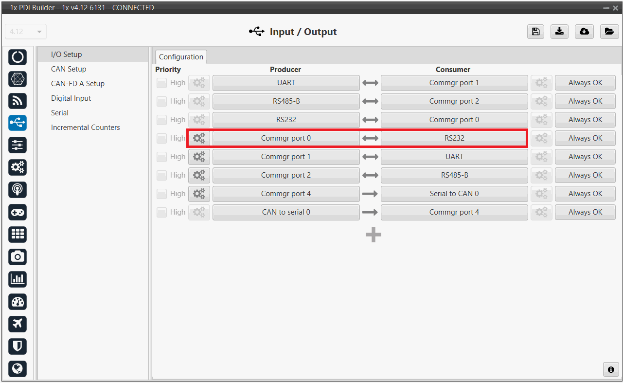 A practical example of the use of this menu are 1x ground unit configurations. These configurations should have configured a Routing of Address 2 (App) (Veronte applications, in this case Veronte Ops) through the Commgr port to which the RS232 consumer is connected (to allow connection to the PC). In this example, Port 0 producer is the one connected to RS232 consumer.