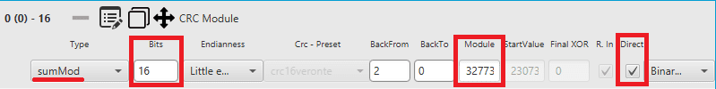 sumMod: The CRC module (sumMod) is a process to calculate a checksum, which is used for error detection purposes. It processes the sum of all bytes from a sequency, and uses a euclidian division by the module parameter to obtain the CRC result code.
