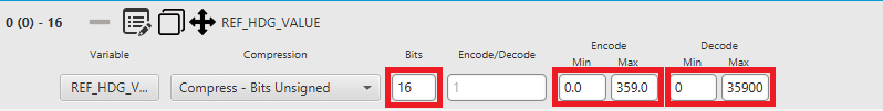 In the example shown below, a real user variable (32 bits) is being used to receive data from an external device. This data corresponds to the heading angle of the aircraft (which goes from 0 to 359 degrees). The device is sending this information in a 16-bit data frame and the angle value times 100 (hence why the Decode parameter goes from 0 to 35900). This needs to be saved in 1x PDI Builder in the user variable in the range 0 to 359 (Encode).