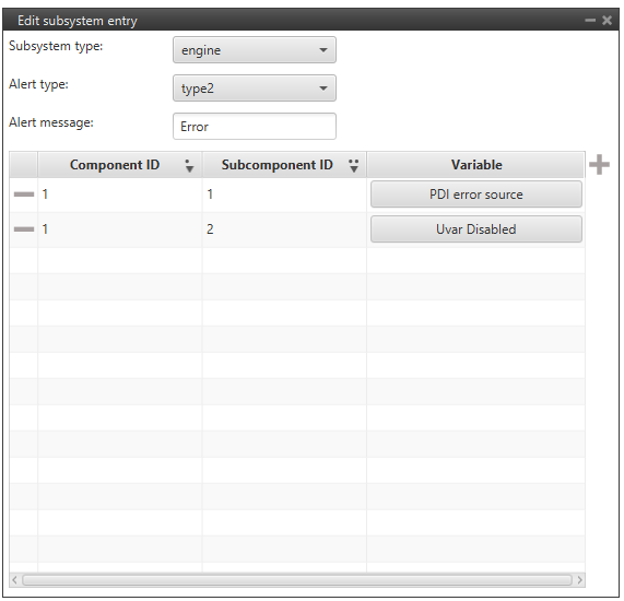 This window is used to create or modify the mapping between internal system errors and the standardized STANAG 4586 subsystem alerts. It ensures that when a specific component fails, the GCS receives a clear and categorized notification.
