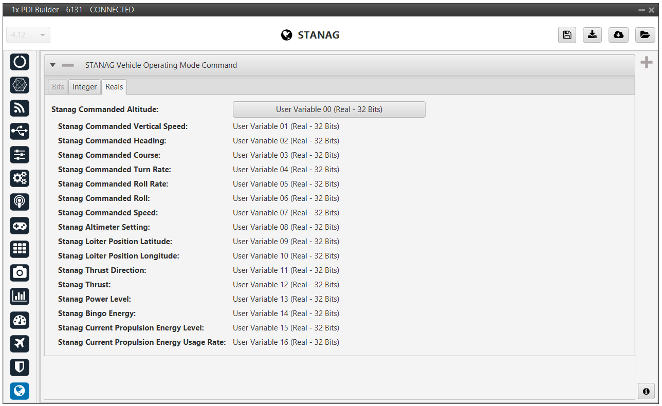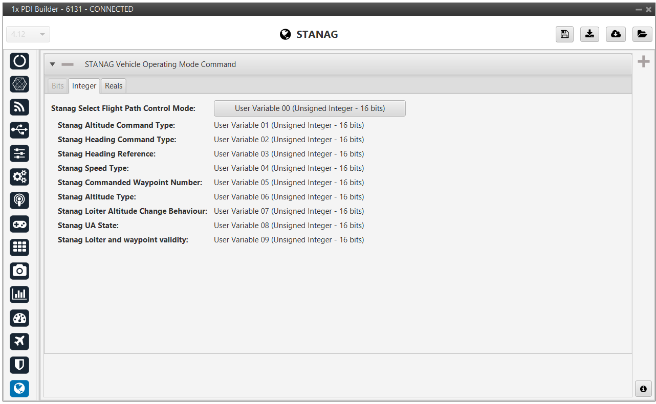 • STANAG 4586 Commanded Waypoint Number: Identifies the integer variable that tracks the active waypoint being targeted by the GCS.