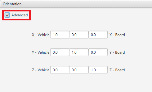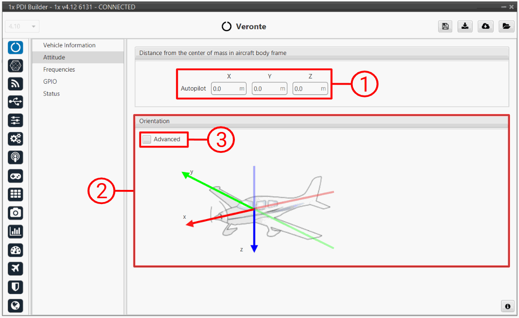 Orientation: It is not compulsory to install the autopilot aligned with the aircraft axis. In order to indicate the autopilot's relative position inside the platform, select the advanced option (3). A matrix relating vehicle axis and autopilot axis is needed to be filled in. The case of a non-orthogonal installation can be covered.