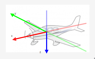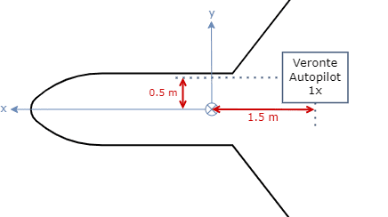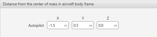 Distance from the center of mass in aircraft body frame: The autopilot's distance from the center of mass must be defined. This distance is entered in meters and accordingly to aircraft axis. If the autopilot is not located in the center of mass, it will measure a non-zero acceleration when turning. Distance from the center of mass in aircraft body frame is used to compensate this value. An example is presented below: