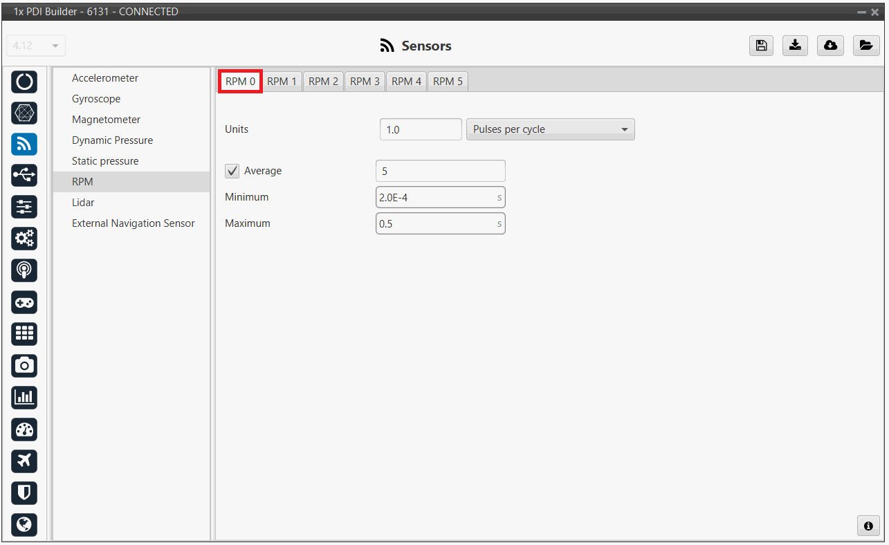 RPM Sensors - RPM configuration For more information about this panel, visit the RPM - Sensors section of the 1x PDI Builder user manual.