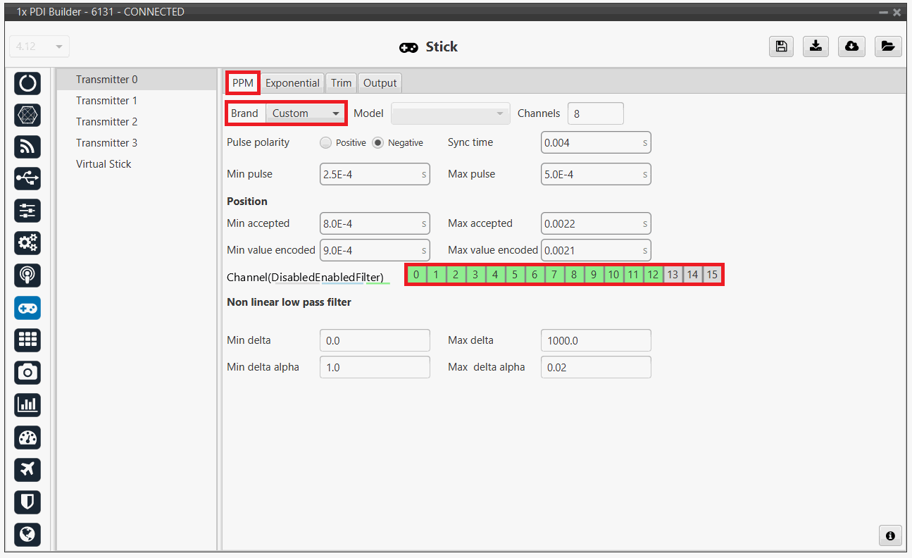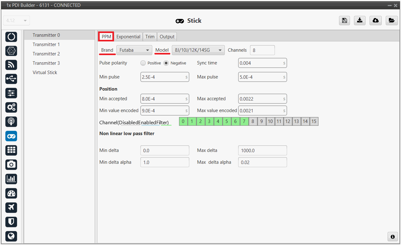 3. Go to Stick menu Transmitter 0 panel PPM tab.