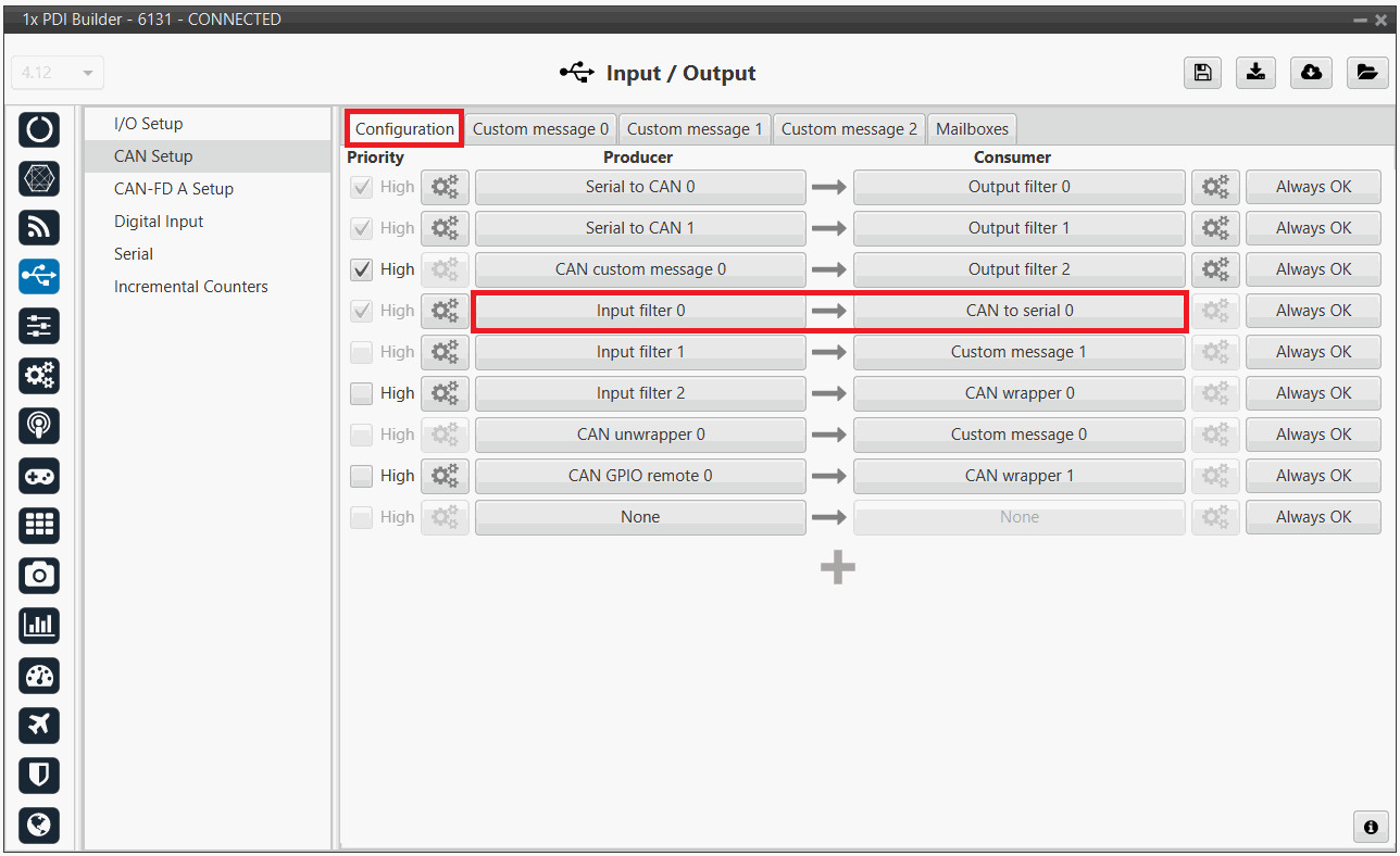An Input filter producer is connected to a CAN to serial consumer. In this example, Input filter 0 is connected to CAN to serial 0.