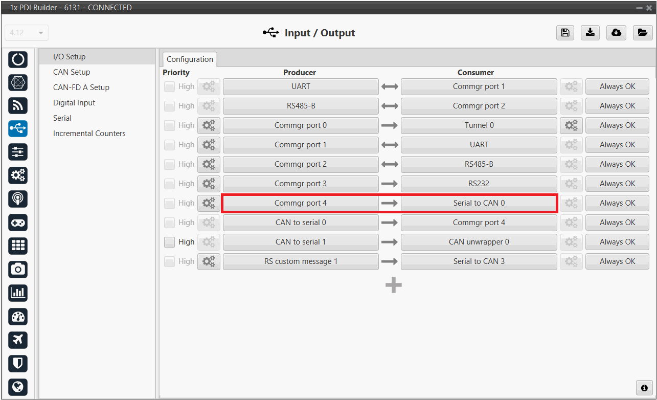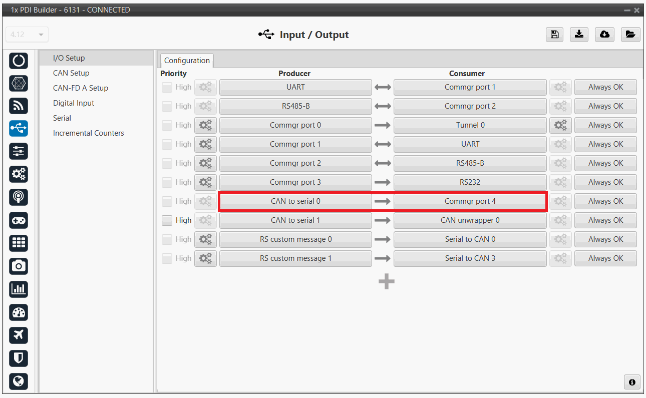 In this example, CAN to serial 0 producer is connected to Commgr port 4 consumer, and Commgr port 4 producer is linked to Serial to CAN 0 consumer.