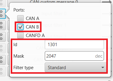 In addition, this Input filter is configured to take data from Port CAN B, with Id 1301, Mask 2047 and Standard as Filter type.