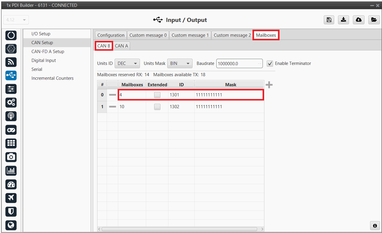 In the Input/Output menu CAN Setup panel Mailboxes tab, add at least 4 mailboxes on CAN B with ID 1301.