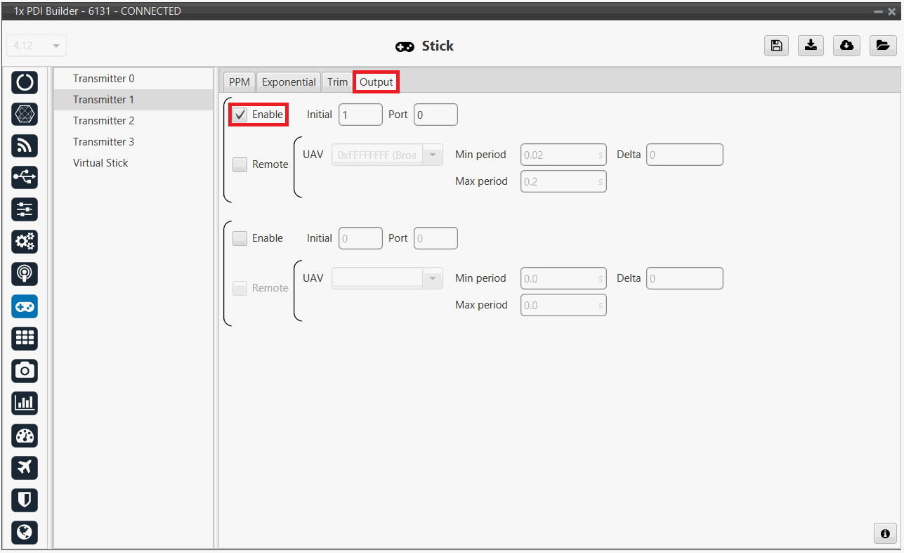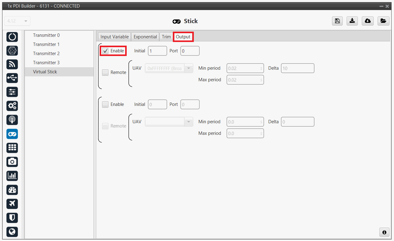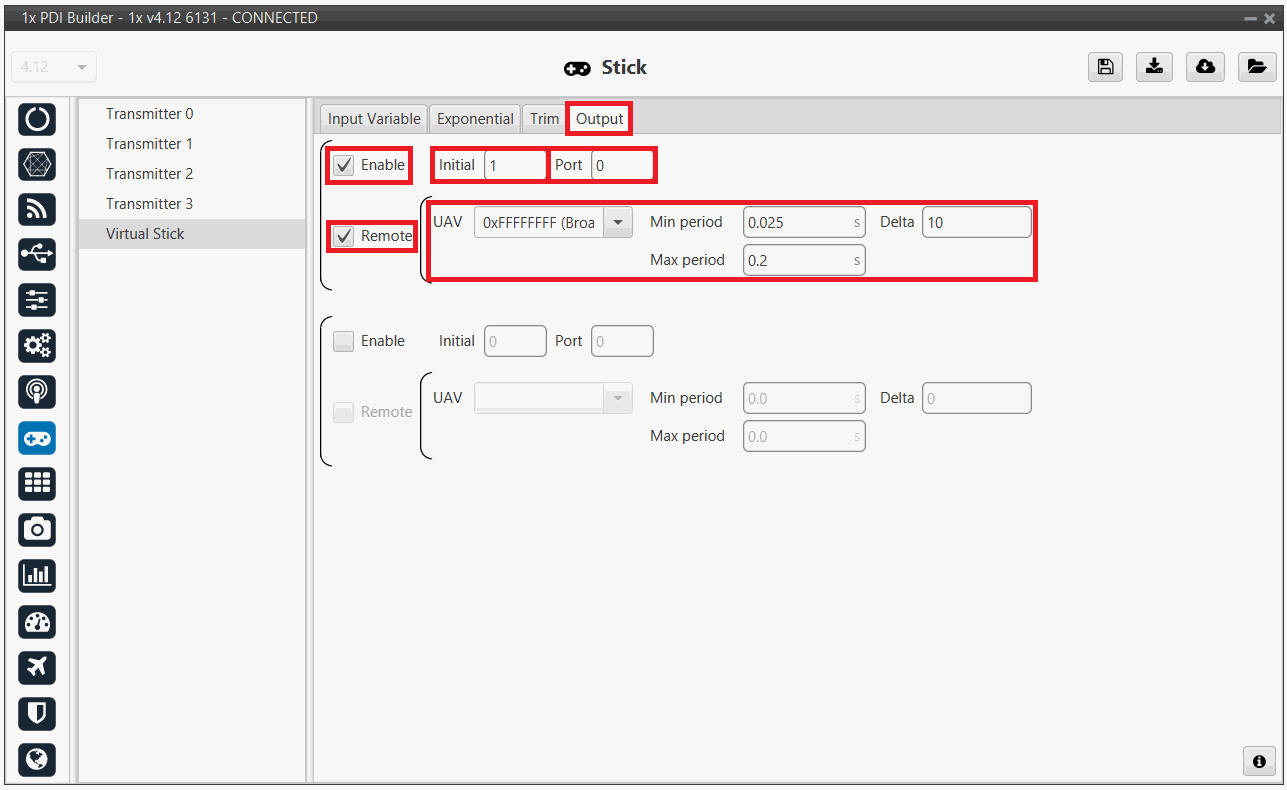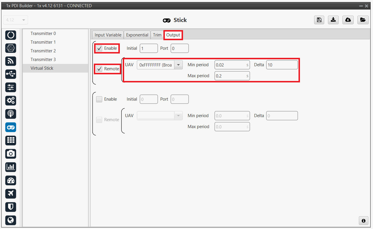 Click on Enable and on Remote to send the stick information to the air unit. Please check the recommended values for the configurable parameters described in the Ouput - Stick section of this manual.