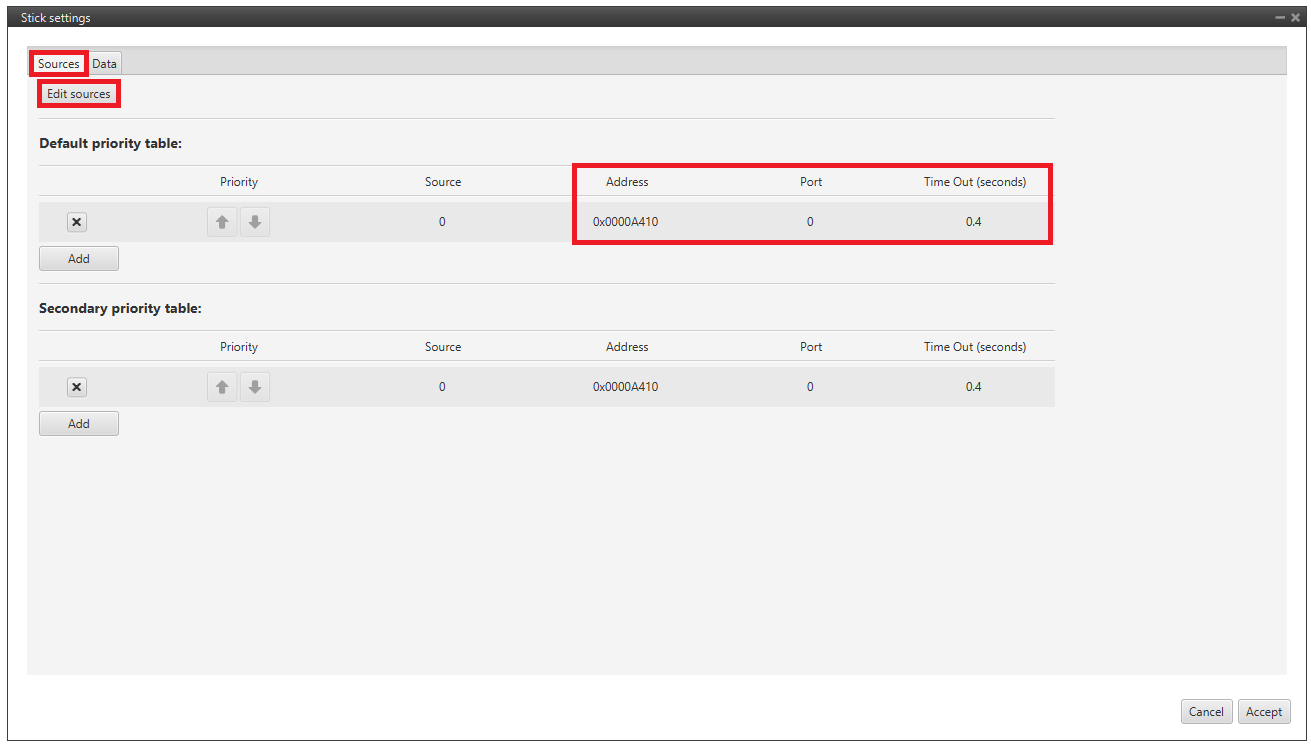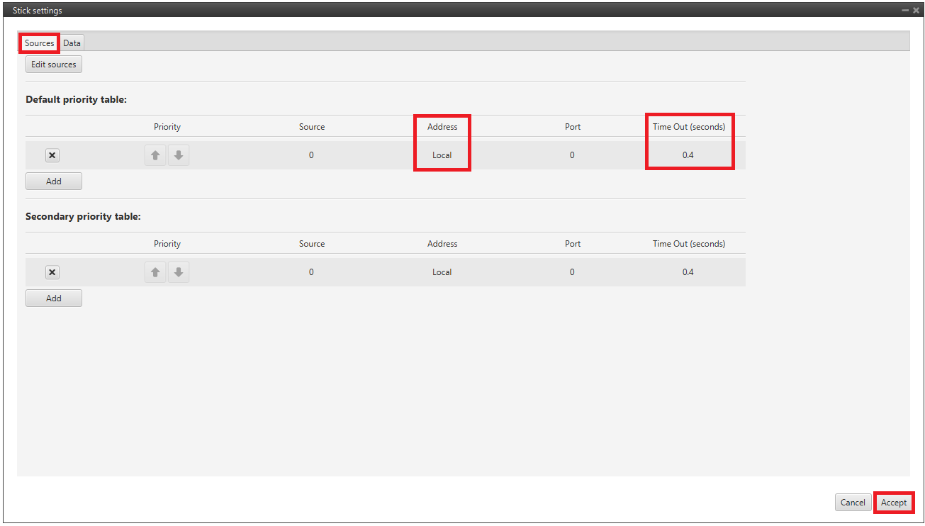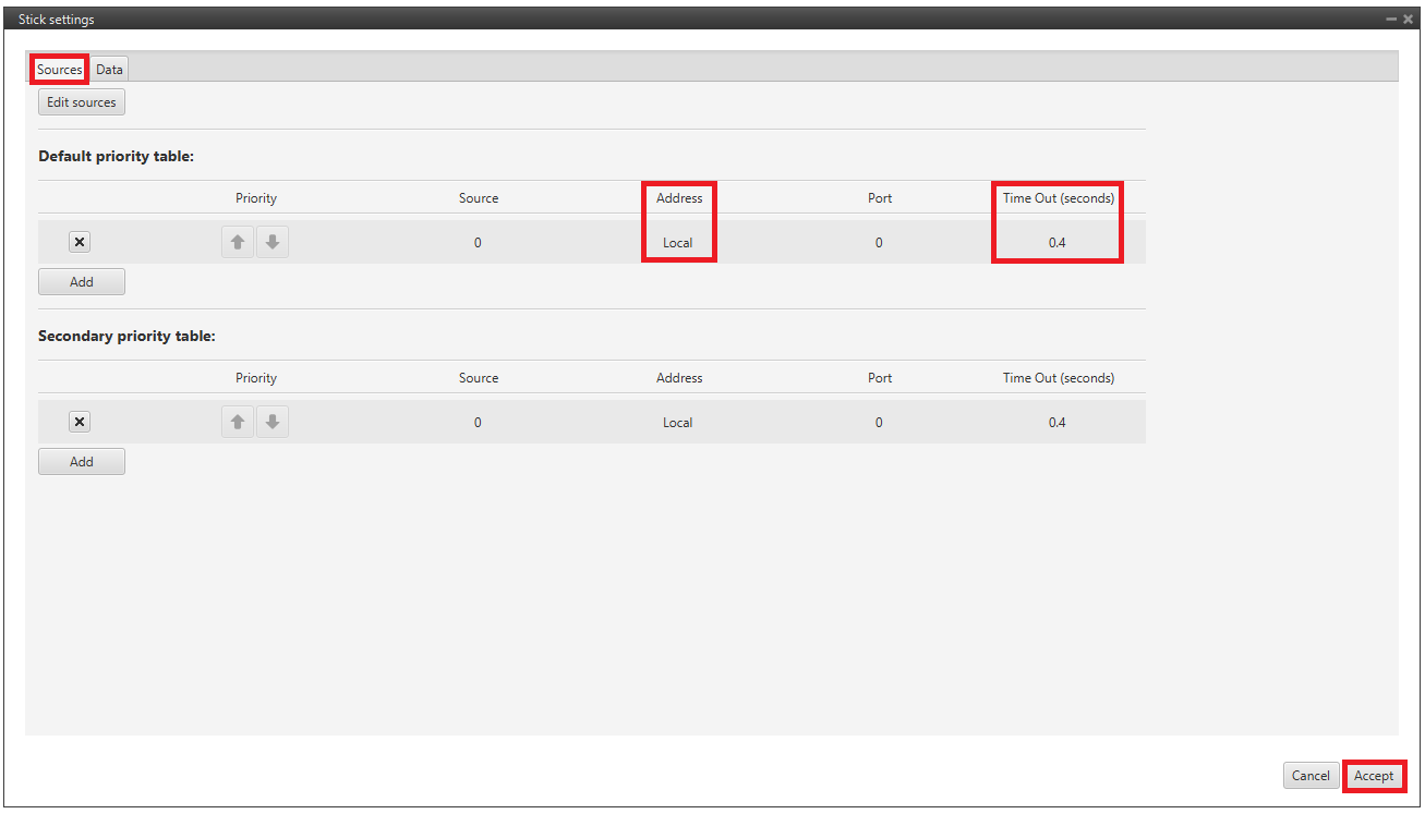 Input the address as Local to receive the stick information from that source and put it as the highest priority in the priority table. We recommend a Time Out of 0.4 s.