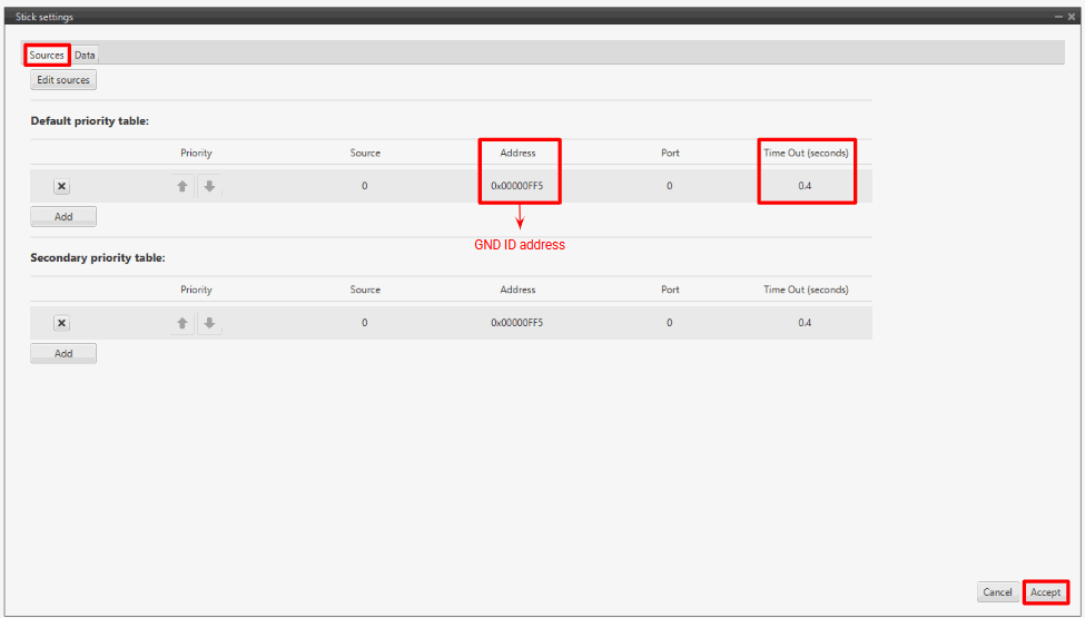 Input the ground unit address to receive the stick information from that source and put it as the highest priority in the priority table. We recommend a Time Out of 0.4 s.