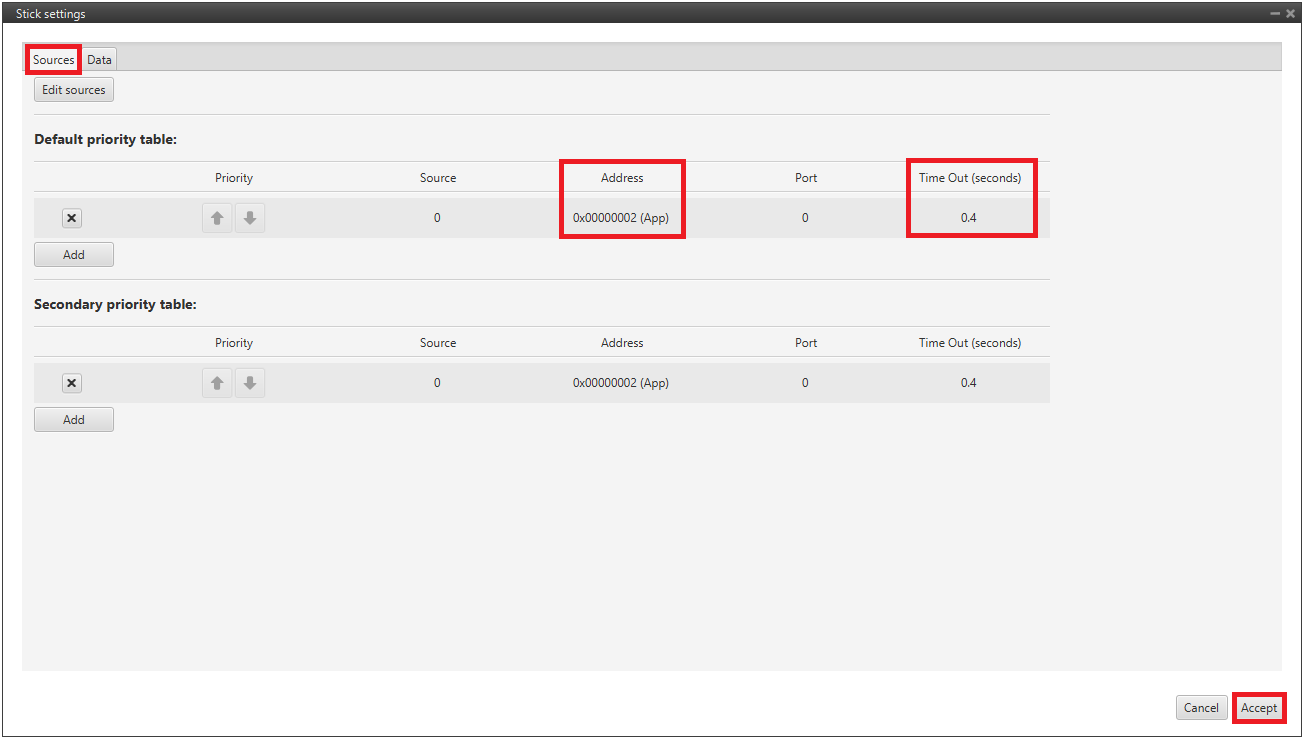 Add a source with Address 2 (App) (App 2) to receive the stick information from the stick widget (of Veronte Ops) and put it as the highest priority in the priority table. A Time Out of 0.4 s is recommended.