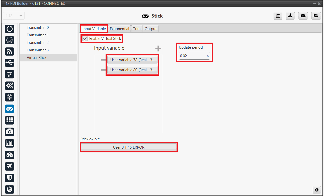 It is necessary to configure a Virtual Stick to process the stick information received from sources other than PPM or USB (by CAN, Serial, ADC, etc.). This stick data must be stored in user variables, and once the virtual stick is configured, these will be processed as stick control signals.