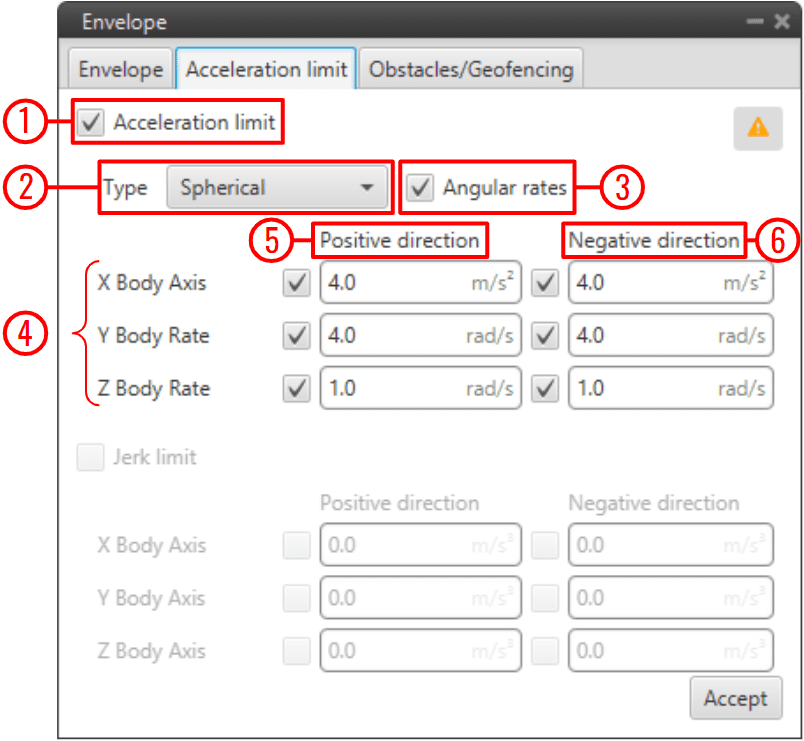 - Deceleration: This can only be configured when Waypoint option is enabled. Maximum allowed acceleration/deceleration to meet the desired velocity.
