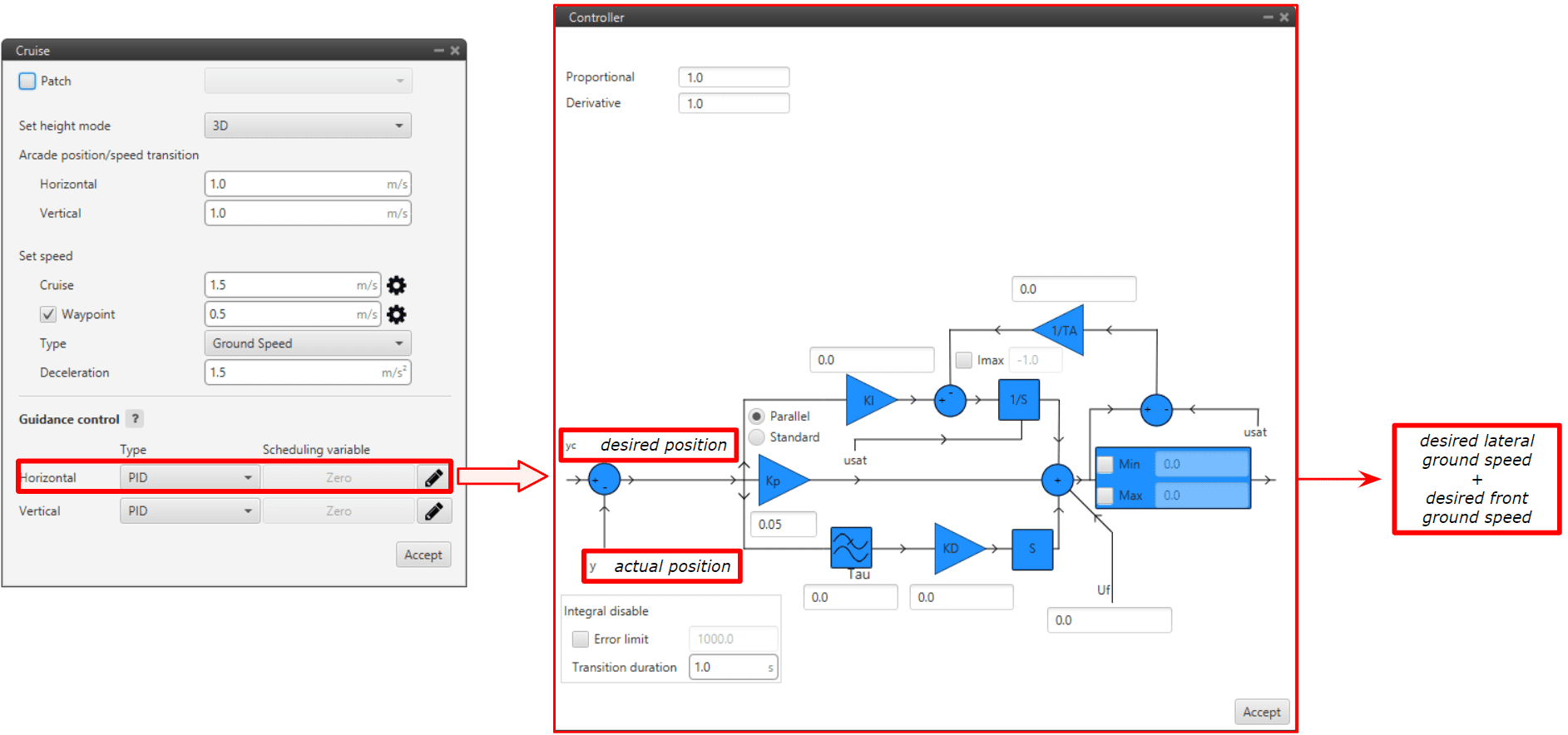 icon of both guidance, a pop-up window will appear where the control parameters should be entered, for more information on the latter check Control blocks.In the horizontal-position PID (see image below), North-East current position of the aircraft is compared to the desired position. The output of the PID controller is going to be a ground speed in the North-East plane, which translates into a desired lateral and front ground speeds in body axes. The same logic applies for the vertical-position PID.