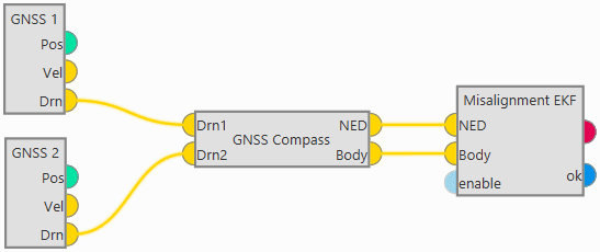 GNSS Compass block takes two relative position measurements and converts them to misalignment vectors to use in the EKF for attitude correction.