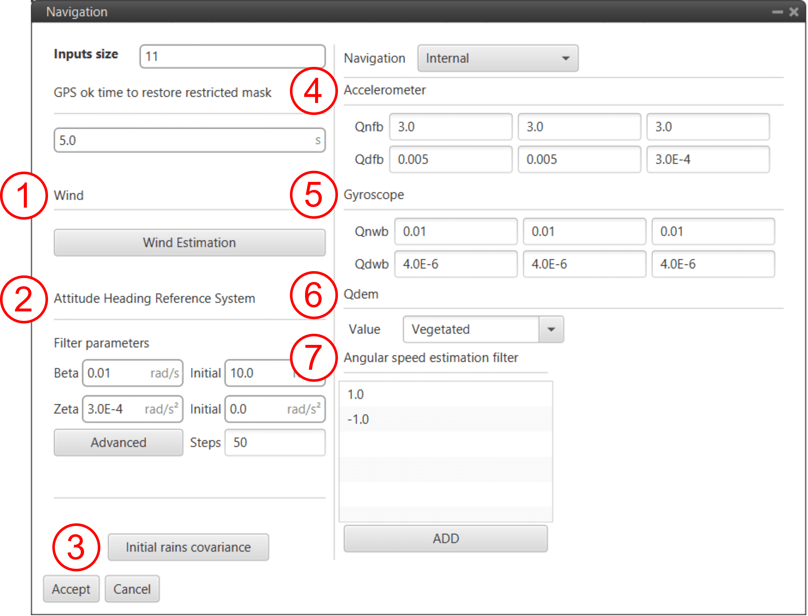 - Accelerometer gain: Manage the weight of the accelerometer raw readings when the given measurements are too dissimilar from the expected Earth's gravitational field.