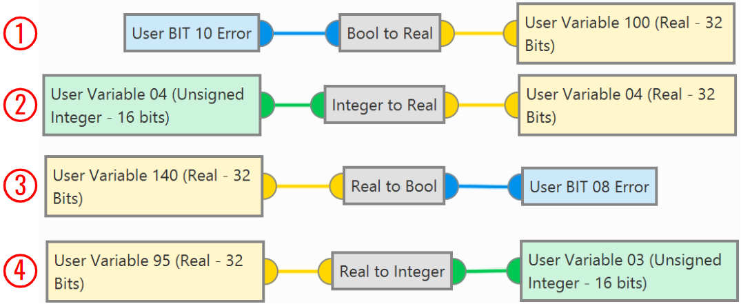 These blocks allow to change from one data type to another. There are four different blocks available:
