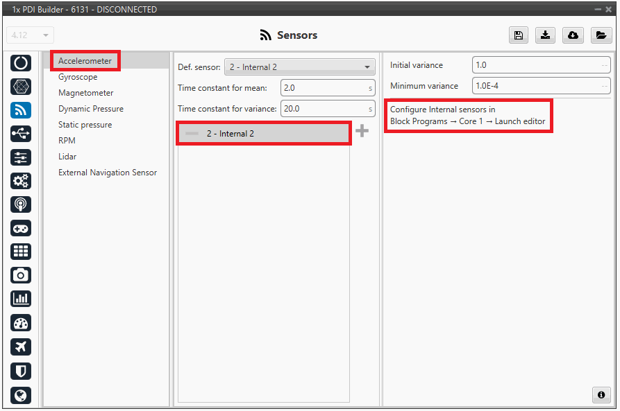 Internal sensors must be configured in Core 1 - Block Programs.