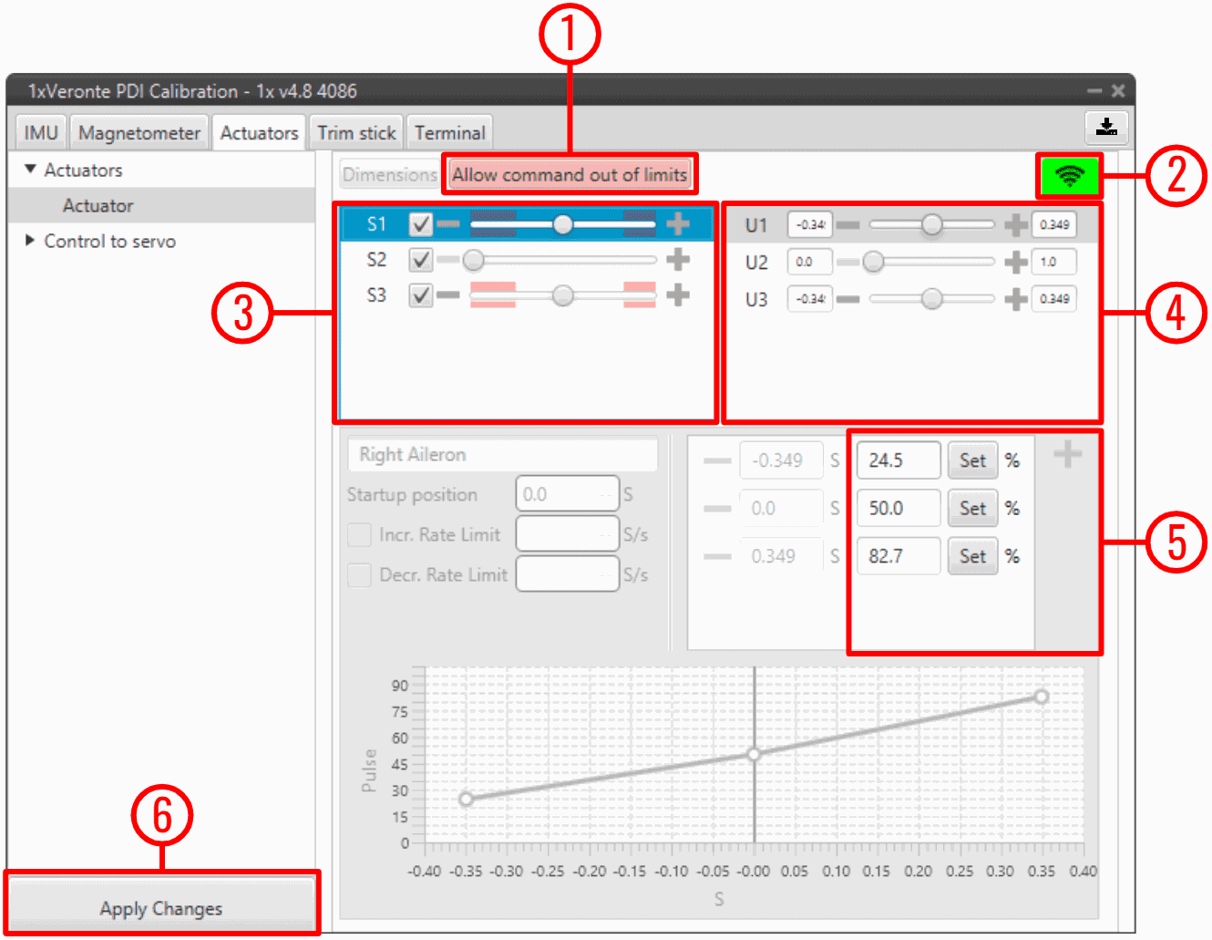 Trimming can be performed by moving the servos in three different positions: zero position, minimum and maximum deflection angle (angles are usually physically limited). These positions must be entered and saved in the software by clicking on 'Apply Changes' when the actuator is in the desired position. Otherwise, the position can be entered manually.