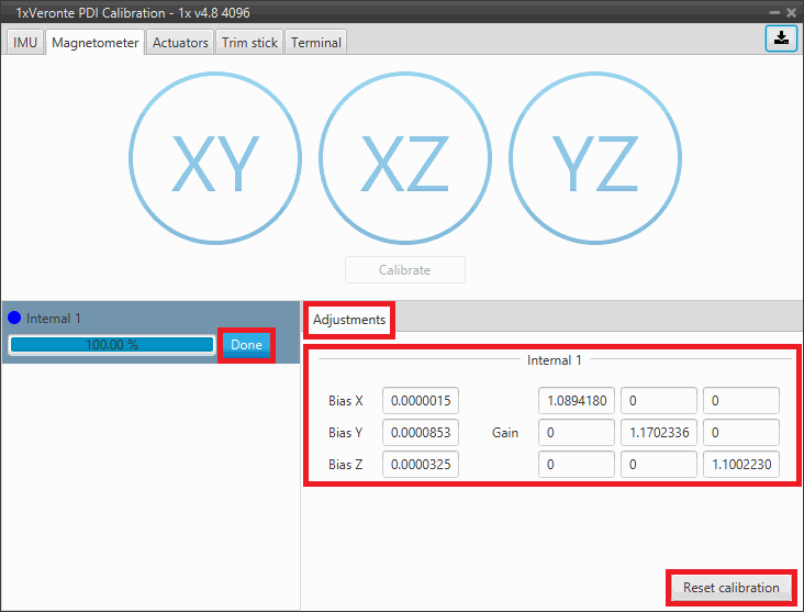 The calibration results, Bias X/Y/Z and Gains measurements, displayed in the Adjustments tab.