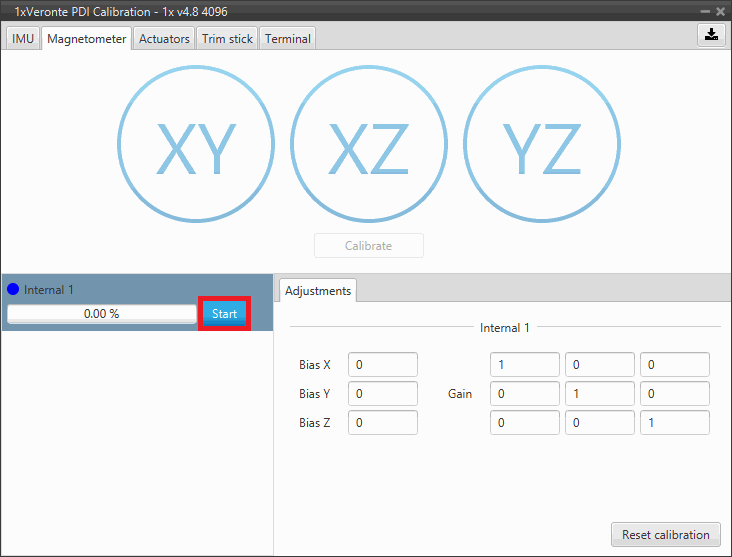 To start the calibration, press the Start button of the magnetometer sensor to be calibrated, so that the system can capture the data from the magnetometer.