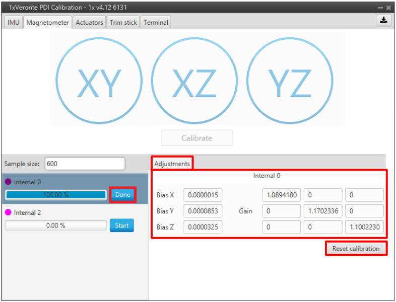 • The calibration results, Bias X/Y/Z and Gains measurements, displayed in the Adjustments tab.