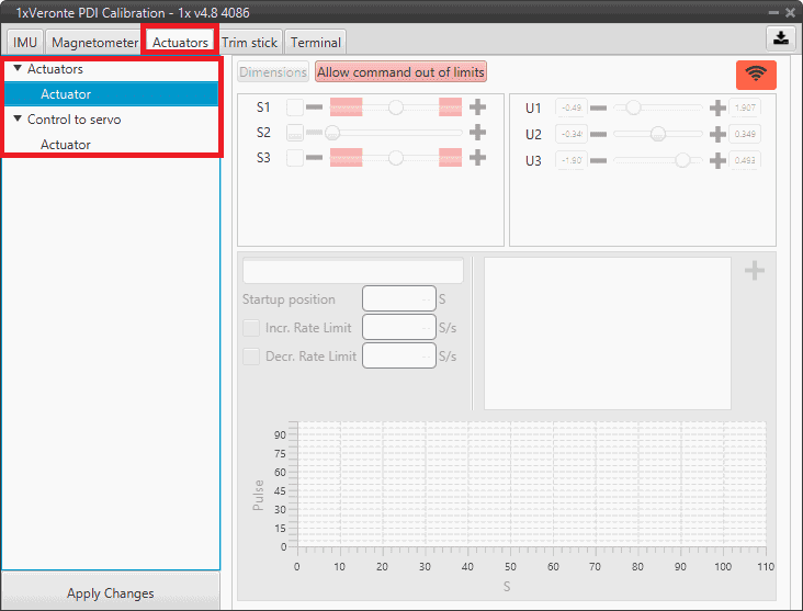 Trimming can be performed by moving the servos in three different positions: zero position, minimum and maximum deflection angle (angles are usually physically limited). These positions must be entered and saved in the software by clicking on 'Apply Changes' when the actuator is in the desired position. Otherwise, the position can be entered manually.