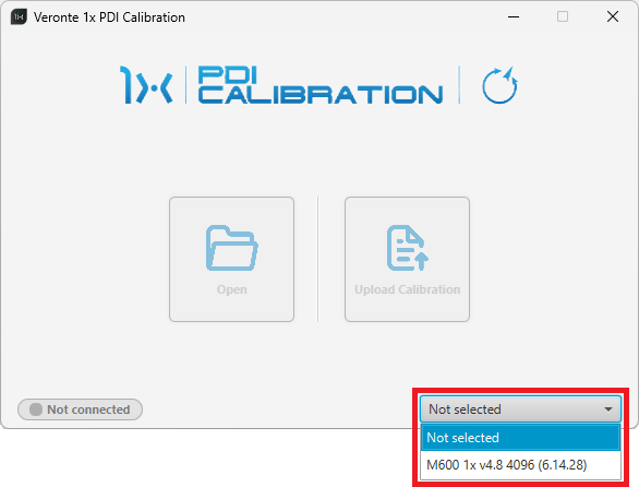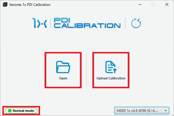 - Open: By clicking on this option, 1x PDI Calibration main interface opens with the calibration files loaded in the connected 1x. Then, the user can calibrate it.