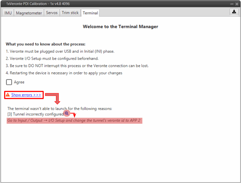 If something has gone wrong, the Tunnel Console will not open and, instead, the panel will report of the error occurred and how to fix it: