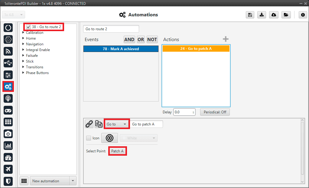 To define the action triggered by the event, set up a Go to action. This action guides the aircraft to the selected patch. For more information, visit the Go to - Actions section of the 1x PDI Builder user manual.