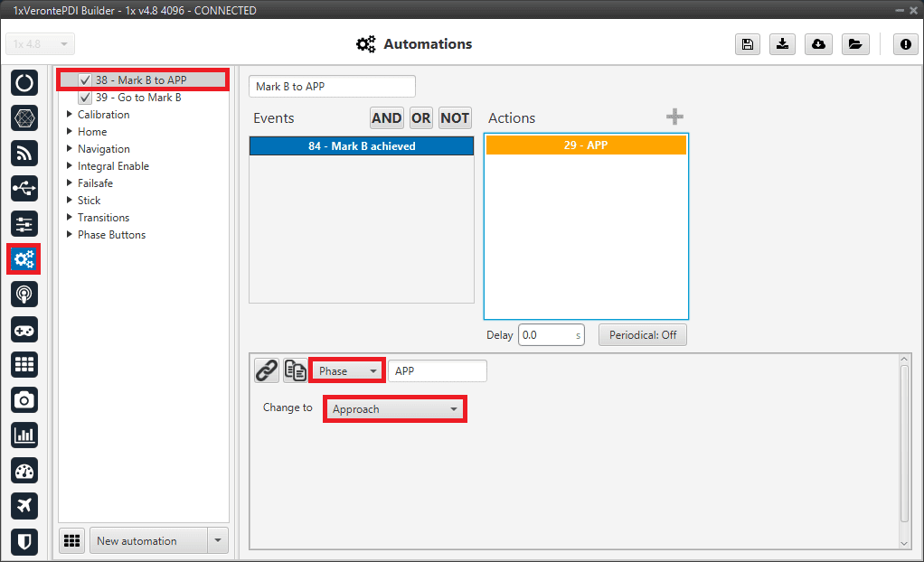 To define the action triggered by the event, configure a Phase action and select the phase to change, in this case to the Approach phase.