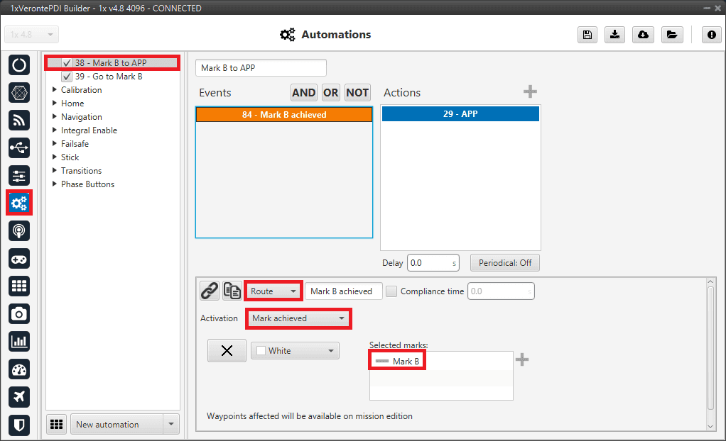 In the first mission, which is the same as the one created for Operation 1, the Mark A is defined. Then, when the aircraft achieves this mark an automation will send the aircraft to move to the second mission. In this second mission, the Mark B will be defined from which the aircraft will start the Approach phase.