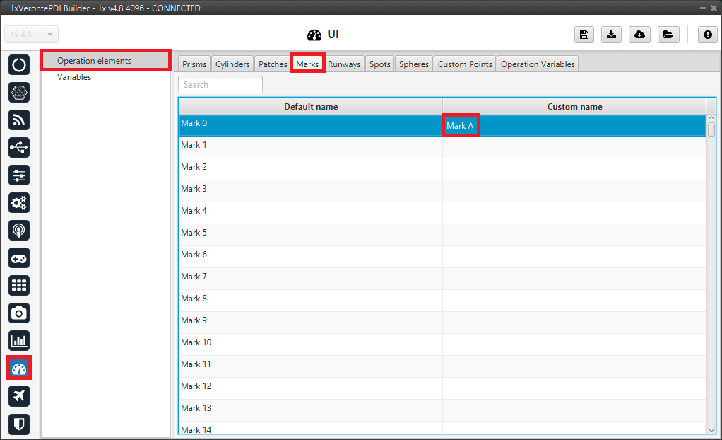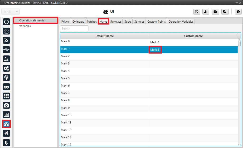 In the 1x PDI Builder app go to UI menu Operation elements panel Marks tab.