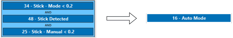 The autopilot switches to Auto mode when the Stick-mode variable has a value of 0 and the Stick-manual variable has a value of 0.