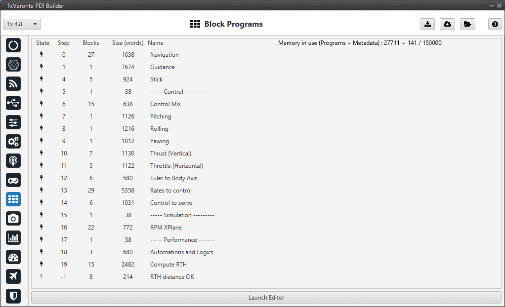 In this section the user can configure and develop the different programs for aircraft control, guidance, navigation, etc.