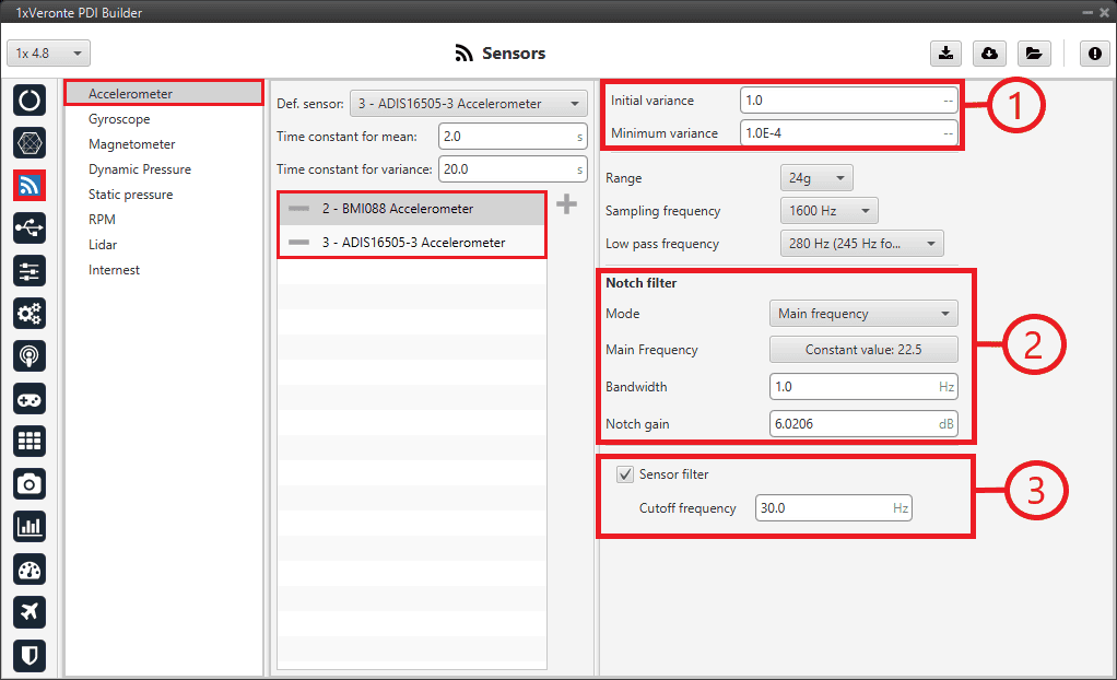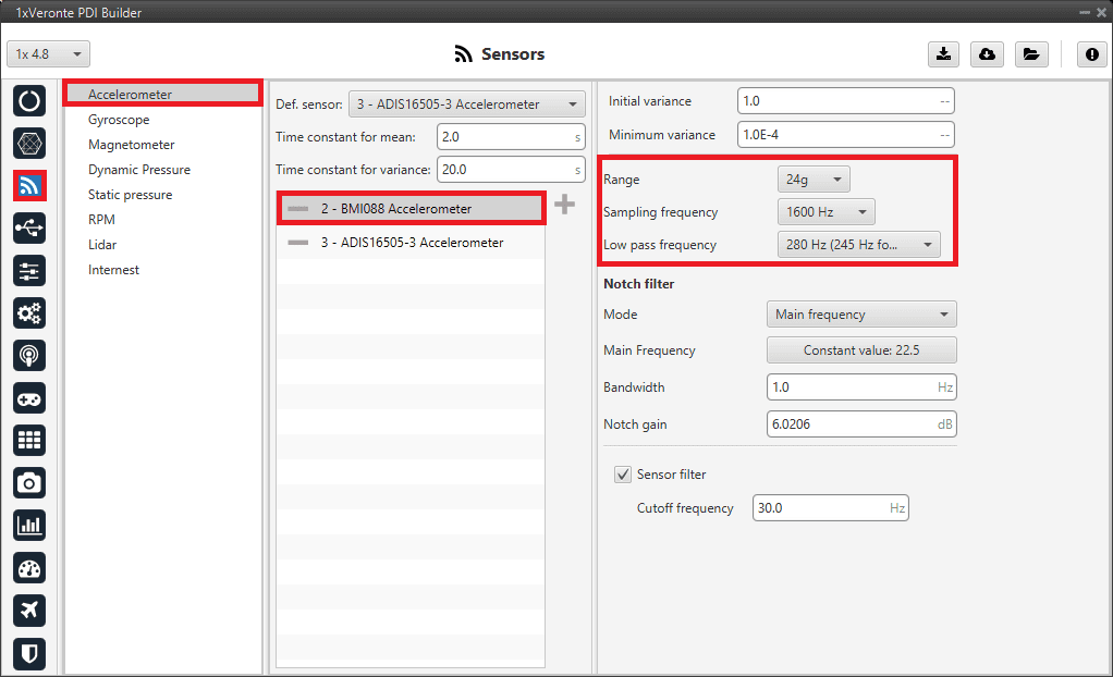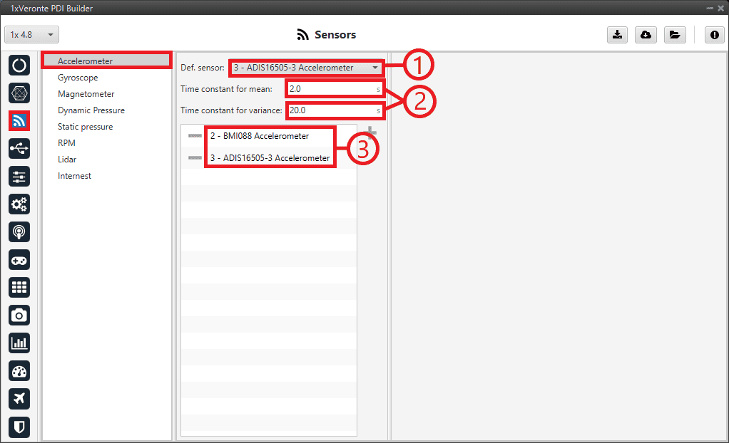 For a detailed explanation of the available accelerometer sensors, please visit the Accelerometer - Sensors section of the 1x PDI Builder user manual.