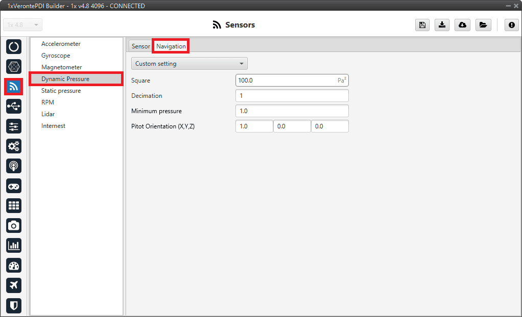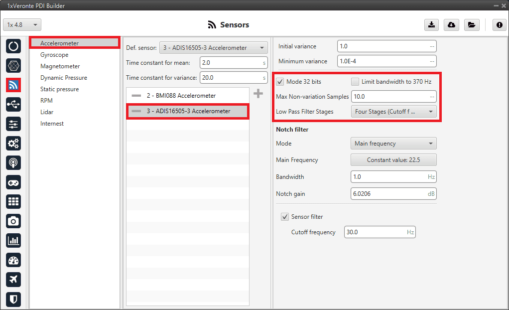 It is recommended to select multiple of these sensors for the navigation algorithm, so that Veronte Autopilot 1x performs a combination of all the measurements of the selected accelerometers.