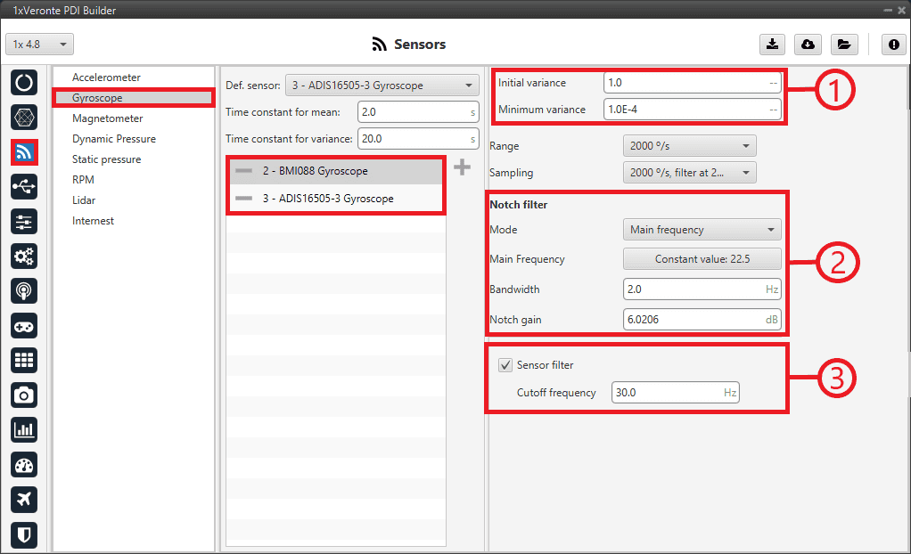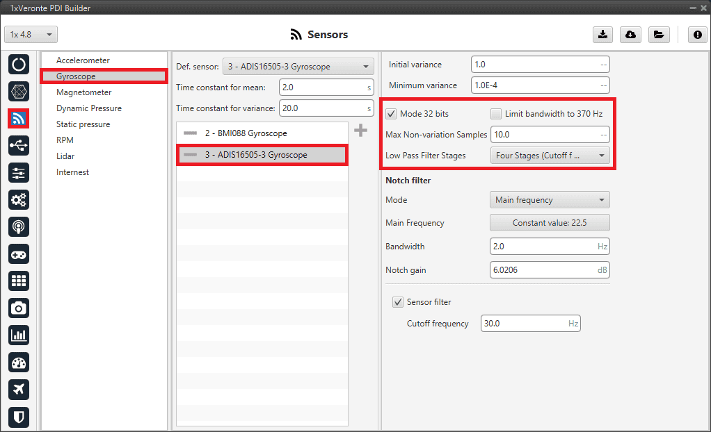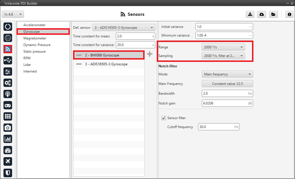 It is recommended to select multiple of these sensors for the navigation algorithm, so that Veronte Autopilot 1x performs a combination of all the measurements of the selected gyroscopes.