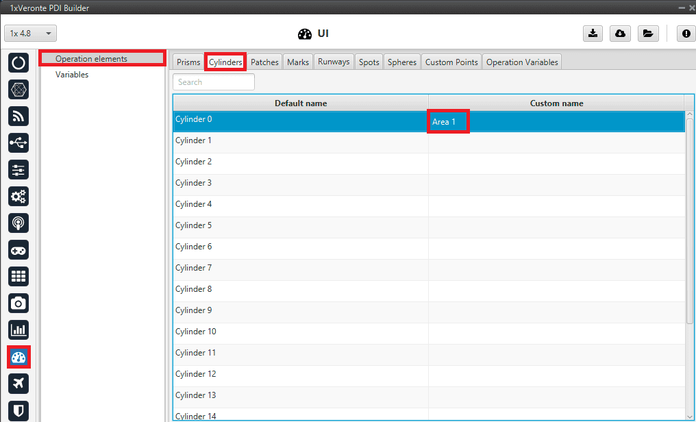 1. In the 1x PDI Builder app go to UI menu Operation elements panel Cylinders tab.