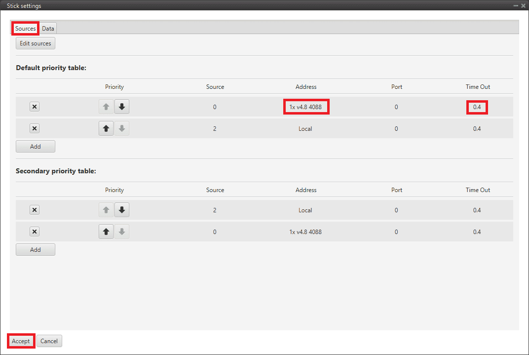 Stick program Input the ground unit address to receive the stick information from that source and put it as the highest priority in the priority table. We recommend a Time Out of 0.4 s.