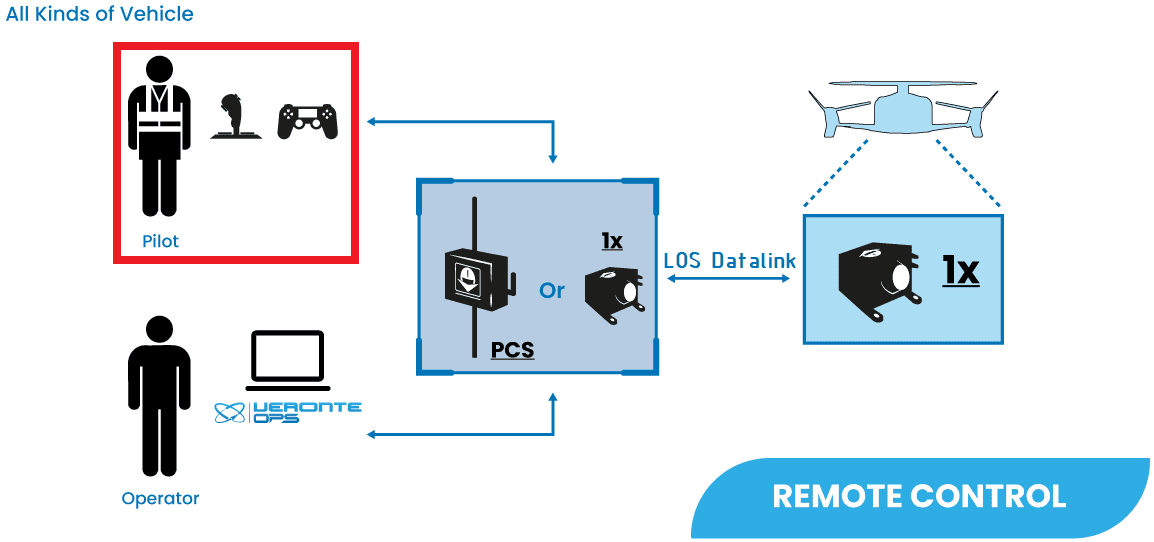 Veronte Standard Layout is the case where the 1x ground unit (or BCS/PCS) sends commands directly to the 1x air unit. So the stick is connected directly to the 1x ground unit.