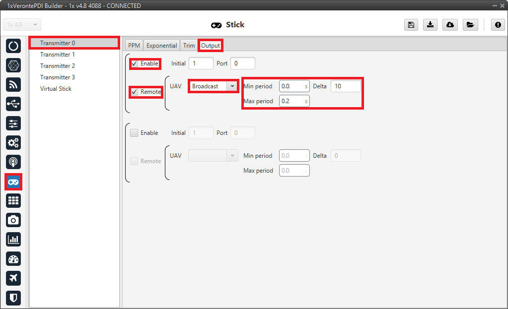 Click on Enable and on Remote to send the stick information to the air unit. The recommended values for the configurable parameters have been entered here, as detailed in the Output - Stick section of the 1x PDI Builder user manual.