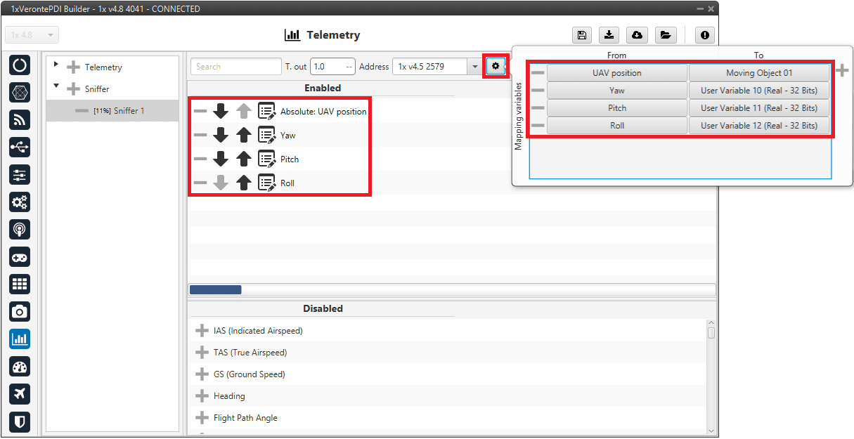 1. Go to Telemetry menu Sniffer panel (for more information about this, see Sniffer - Telemetry section of 1x PDI Builder user manual).