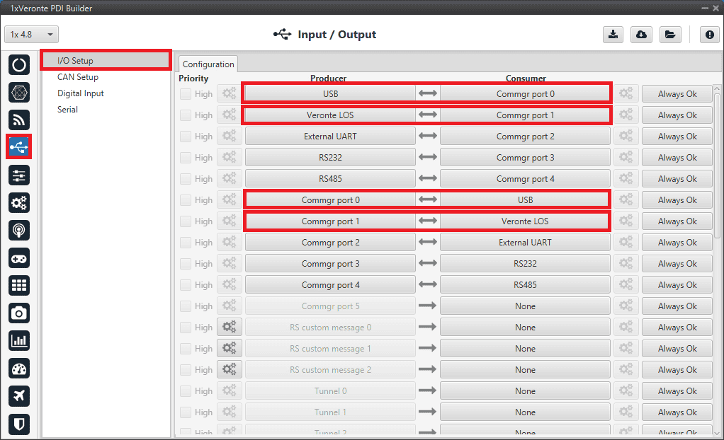 This way, any messages that are received through a Commgr Port (i.e. through Veronte LOS) with address 2, will be re-routed through Port 0 (USB) and received by Veronte Ops software, including any messages generated by 1x ground unit itself.