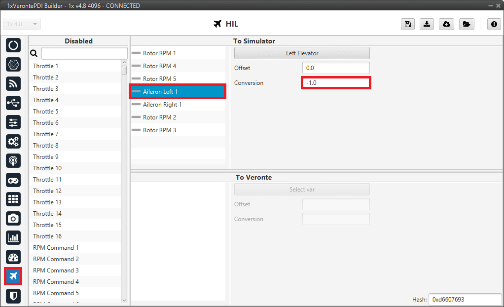 2. Associate each actuator variable (Control Output) of Autopilot 1x that matches that of the simulator.